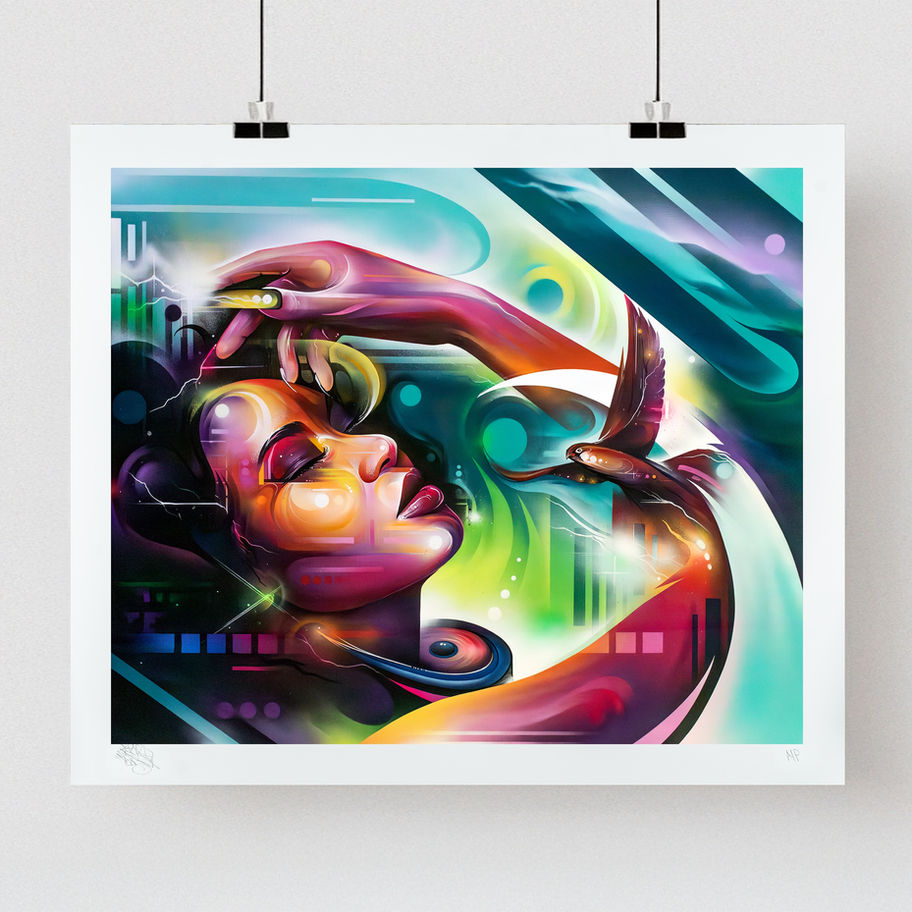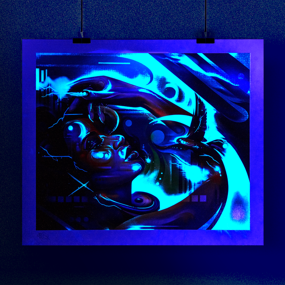 Edition of 5070cm x 60cm Archival Giclee PrintPrinted on Canson Edition Etching 310gsm with 2 silkscreen layers - mirror gloss full varnish, and a hidden UV light reactive layer.Hand signed and numbered by the artist